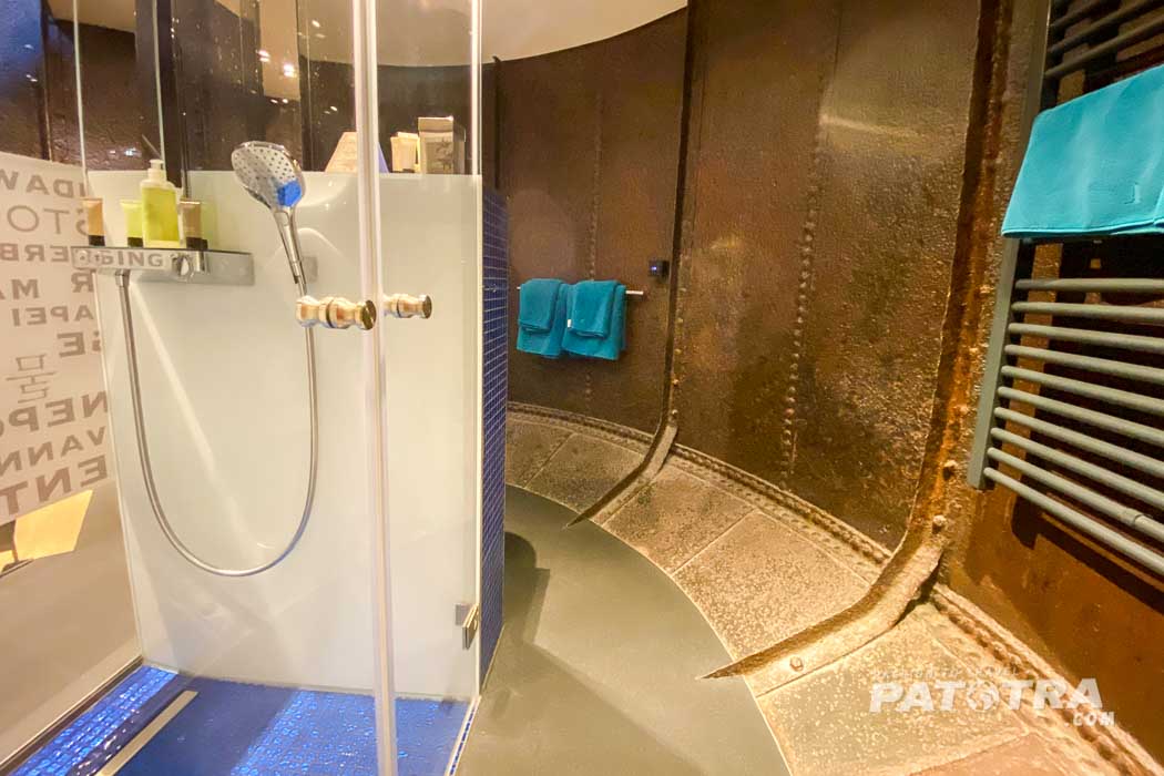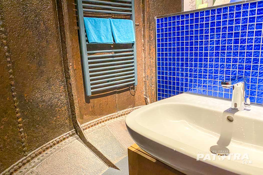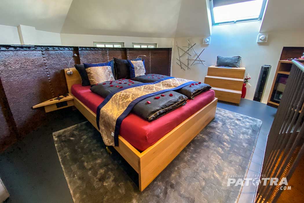 Neben Schreibtisch und einer Minibar prangt zudem ein Fachbildfernseher über dem Treppengeländer. Auch WLAN ist vorhanden. Das grosse Bett ist bequem und obwohl man sich in einem ehemaligen Industriegebäude, bzw. in einem Wasserturm befindet, strahlt der Raum eine angenehme Gemütlichkeit aus.