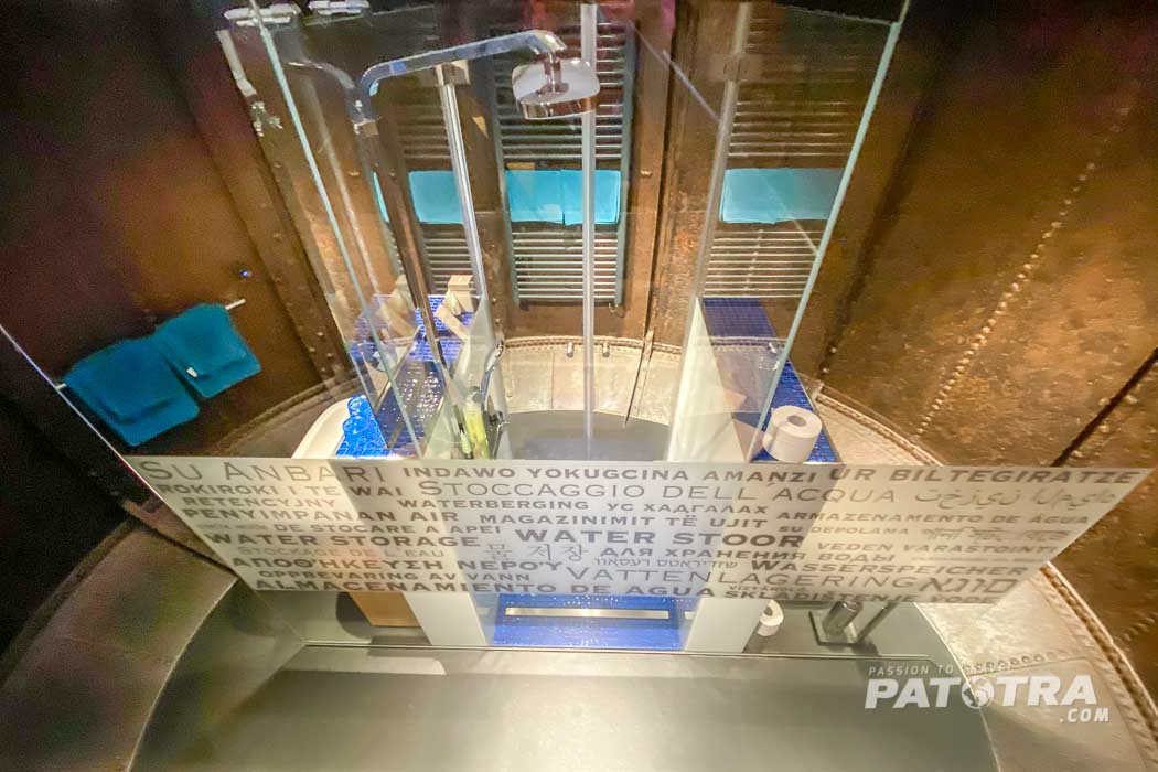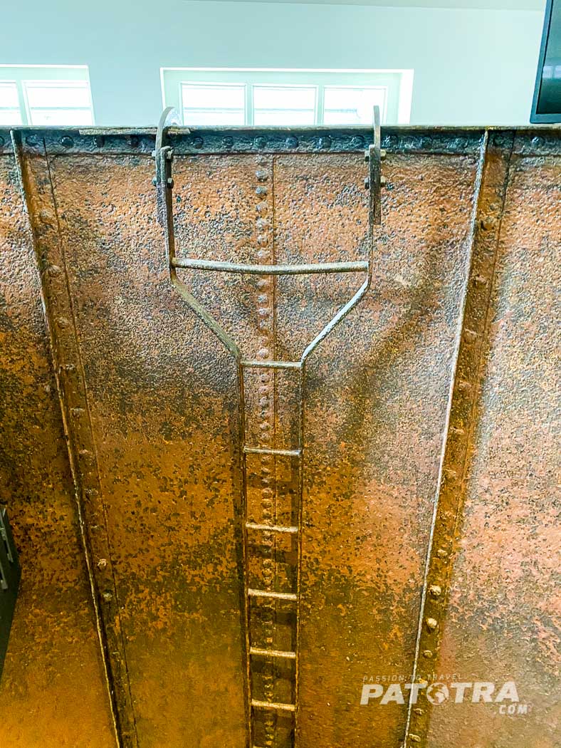 Nach den ersten 50 Stufen lande ich im ehemaligen Wassertank. Die Treppe führt direkt durch den aufgeschnittenen Metalltank.