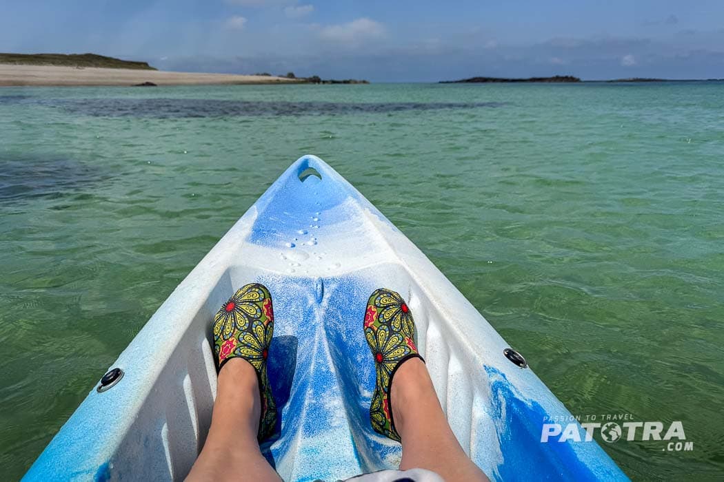 Vom Frühjahr bis etwa Mitte Juli ist die Saison, um Papageientaucher zu beobachten. Eine Kleine Kolonie befindet sich auch auf Herm. Am besten kann man diese mit dem Kajak erleben. Leider sind wir etwas spät dran. Die letzten Papageientaucher haben die Insel vor 3 Tagen verlassen. Wir versuchen dennoch unser Glück und paddeln mit dem Anbieter Outdoor Guernsey einmal um die Insel. Auch wenn wir kein Glück haben, was die Papgeintaucher anbelangt, ist es ein zauberhafter Ausflug. In knapp 2 Stunden haben wir Herm umrundet. Platschnass aber glücklich kehren wir an den Shell Beach zurück. Danach noch ein kühles Bad. Was braucht man mehr?