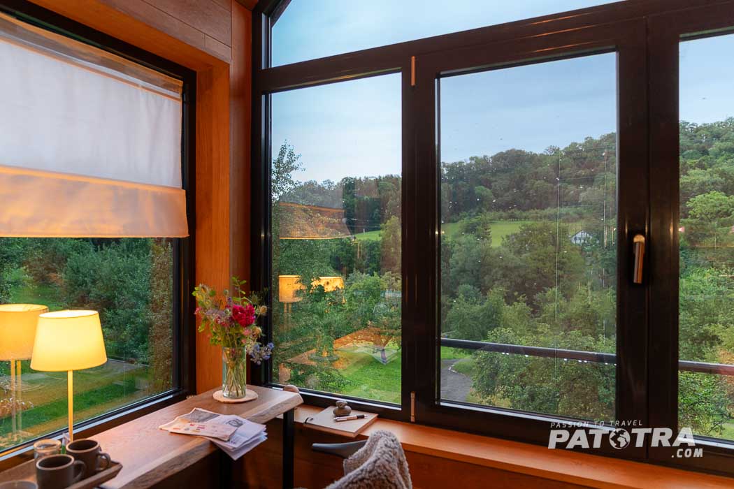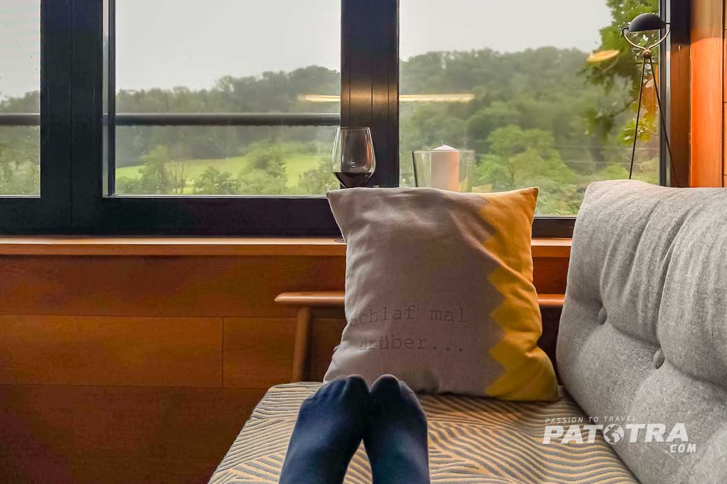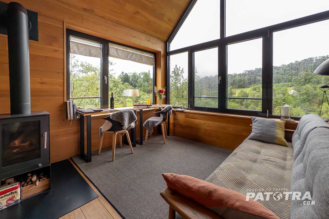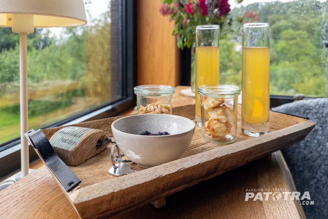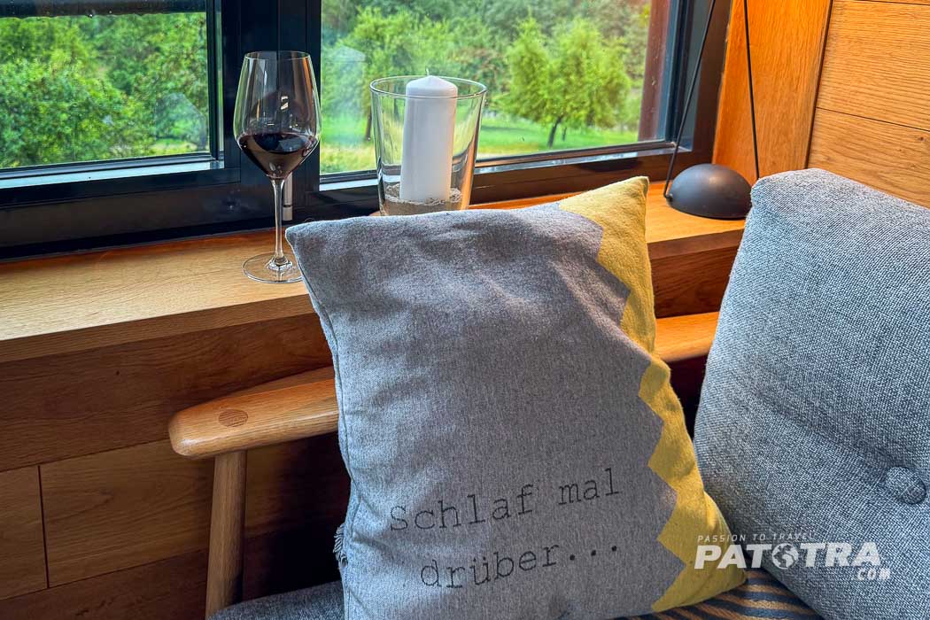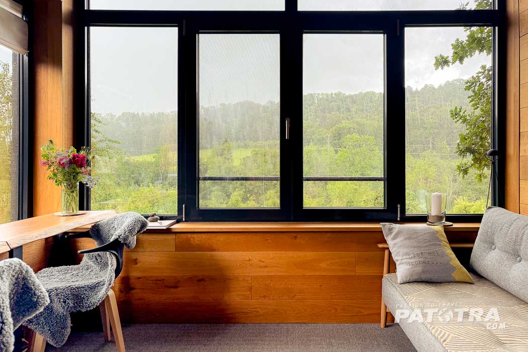 Uns stört er auch nicht. Wir geniessen das sanfte Trommeln der Regentropfen hoch über den Apfel- und Birnbäumen in einem gemütlichen, modernen und super ausgestatteten Baumhaus. Eigentlich ist heute ein perfekter Baumhaustag. Selten habe ich so viel Behaglichkeit erlebt. Man möchte einfach nur sitzen und durch die grossen Fenster ins Grüne schauen und dabei dem Regen zuhören und zuschauen, wie der von den Blättern tropft. Wir wohnen in der Eiche, umgeben von gemütlichem Eichenholz.