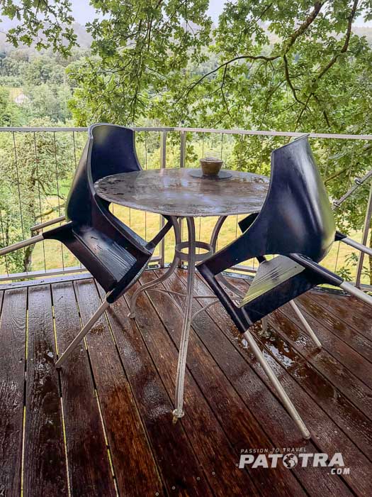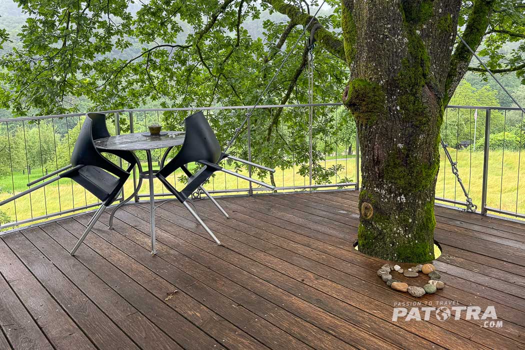 Bei schönem Wetter locken zwei gemütlich Sitzplätze. Einer auf einer Terrasse beim Baumhaus und einer unter dem Baumhaus. Von der Terrasse aus hat man einen Ausblick auf die Thur, die nur wenige Meter vom Baumhaus entfernt durch das Tal fliesst.
